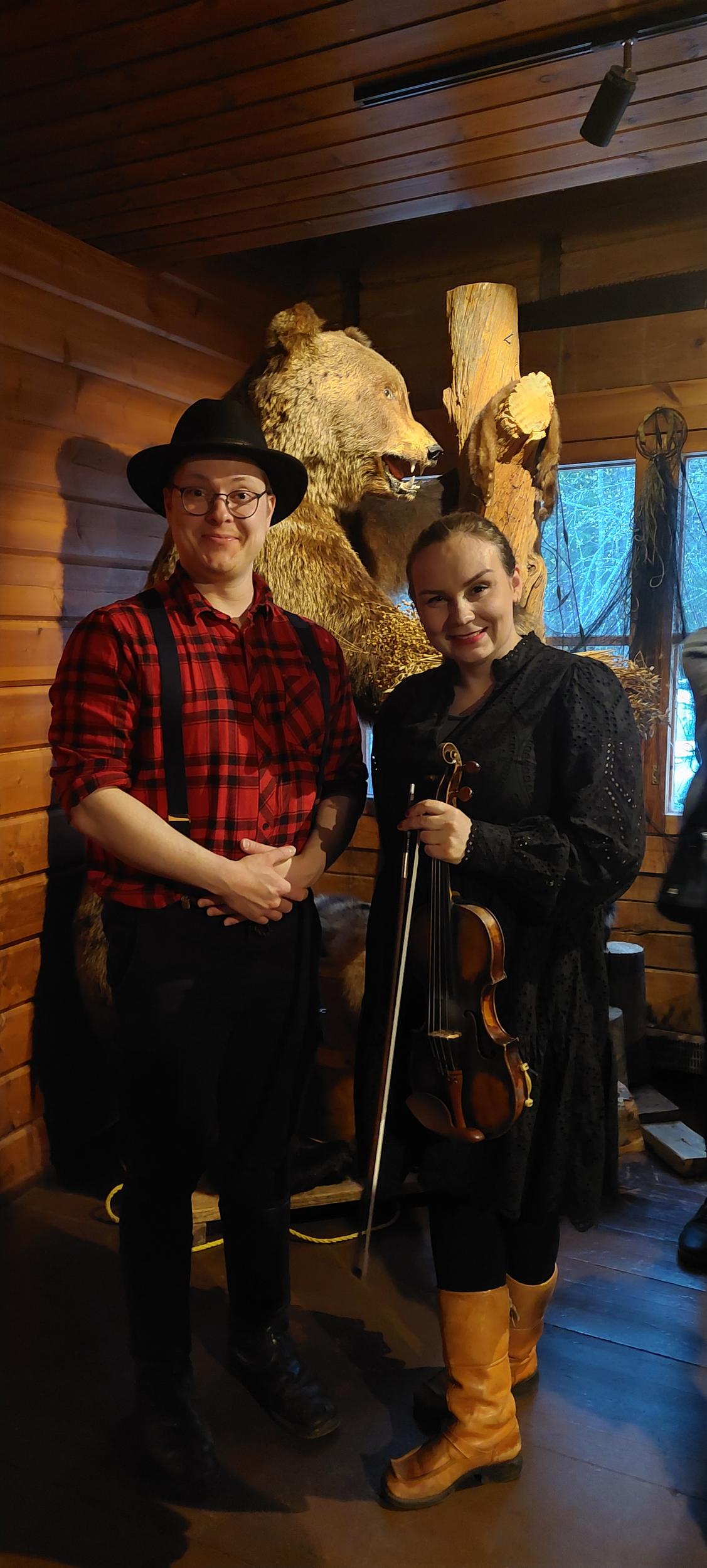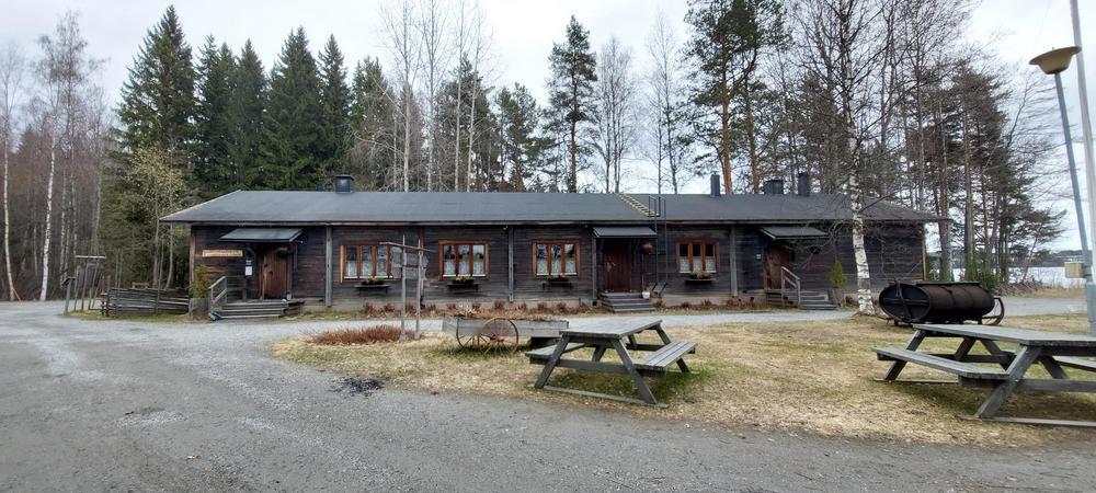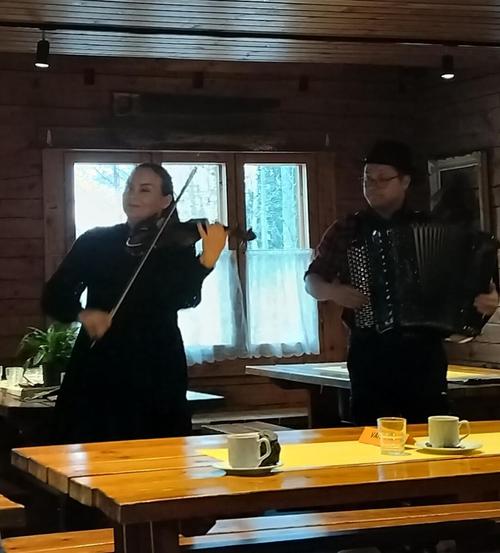 Illemmalla oli vuorossa perinnepäivällinen Jätkänkämpällä, jonne kävelimme noin 600metrin matkan. Ruoka oli maittavaa ja sitä oli runsaasti. Ilta jatkui riemukkaissa tunnelmissa, kun mainio "työsuhdeavioliittopariskunta" Henna ja Janne hauskuuttivat savolaisilla sutjautuksillaan, voe tokkiinsa kuultiin (en laskenut) monta kertaa. Opettivat sen myös meille. Perinteisiä yhteislauluja lauletiin Hennan säestäessä viululla ja Jannen haitarilla. Kiva ilta oli.